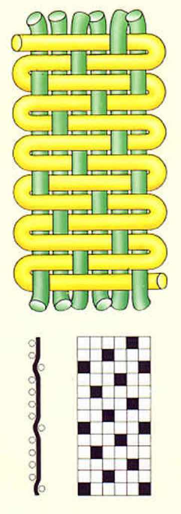 Die Atlasbindung als Gewebebild und Patrone zeigt einen 5-bindigen Atlas.