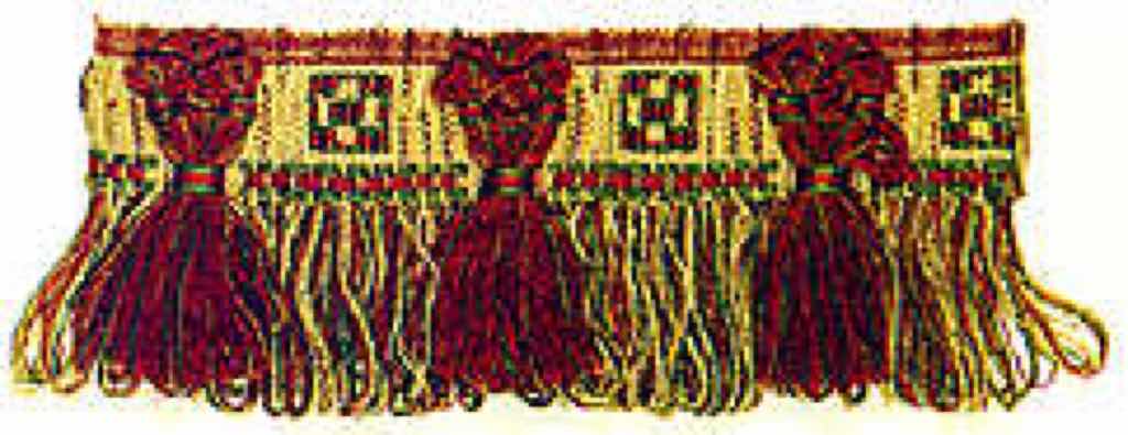 Möbelfranse mit eingebundener Quaste. Die Herstellung erfolgt auf Häkelgalonmaschinen. Die Schnur wird an die Borte angestochen bzw. angehäkelt. Zur Befestigung am Polstermöbel wird auf der Rückseite ein gewebtes, einfaches Nagelband angenäht. Borte und Nagelband werden auf die Franse genäht. In abgezählter Reihenfolge werden jeweils zwei Stengel aus der Franse herausgenommen, in einem Bogen zusammengeführt und zusammengenommen. Ein Schweif aus Viskose-Filamentgarn wird über diesen Bogen eingeschlagen und am Kopf mit einer Drahtgimpe zu einer Quaste abgebunden. Franse, Posamenten.